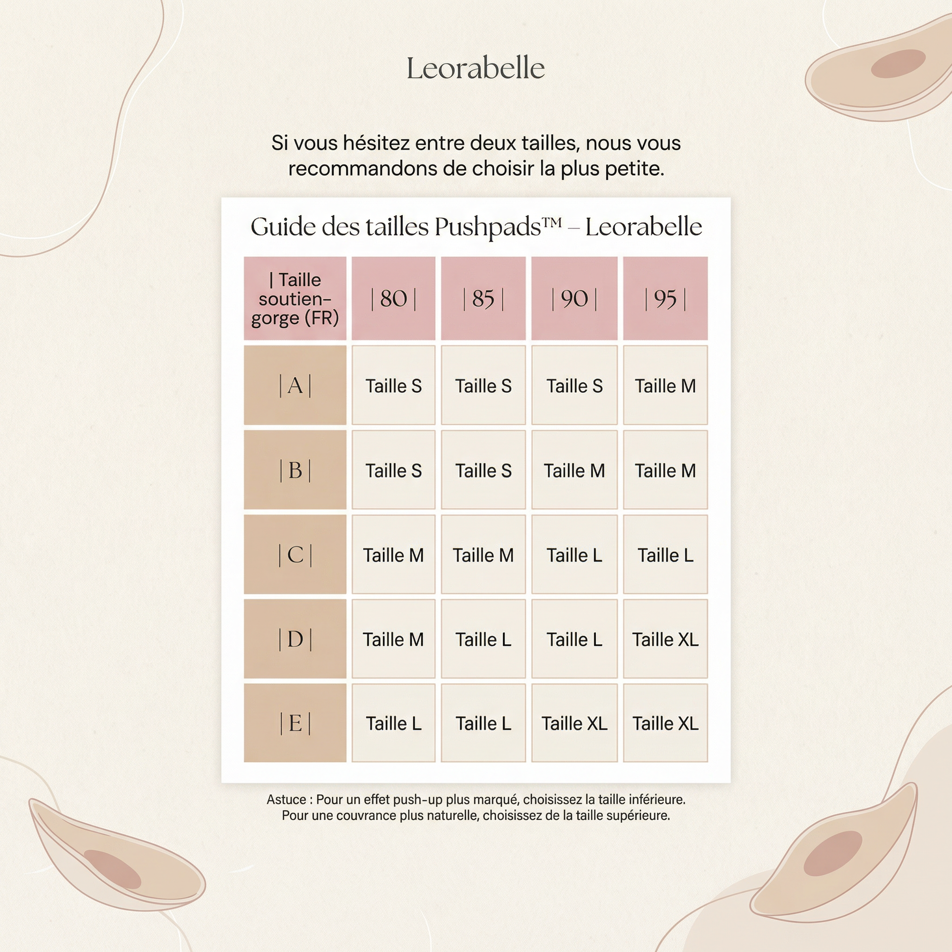 Nous vous recommandons de choisir votre taille de soutien-gorge habituelle. Si vous hésitez entre deux tailles, nous conseillons de prendre la plus grande.
